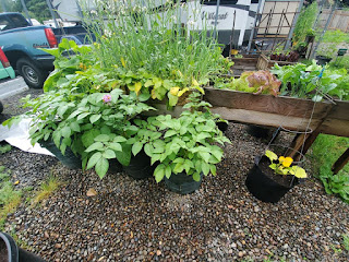 Turning toward our trailer, there are two big pots. I seeded them both in with Chioggia beets. In one, I companion planted coneflowers (ecinachea) and in the other I companion planted dill. These are experiments. I don't know how well they will grow with each other.