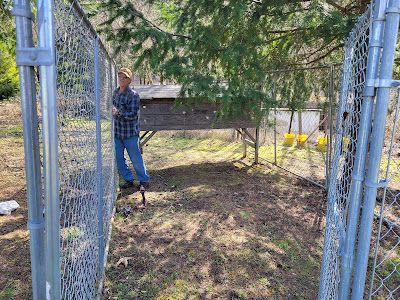 Bob's going to take this chicken run back to the hog pen. The coop is in the middle of the area. We need to trim those fir branches and the run will be topped with a heavy duty tarp and bird netting. Not only do we have ground predators to contend with (coyotes, bobcat, raccoons and, quite possibly, a cougar), we also have air predators (bald eagles, hawks, owls).
